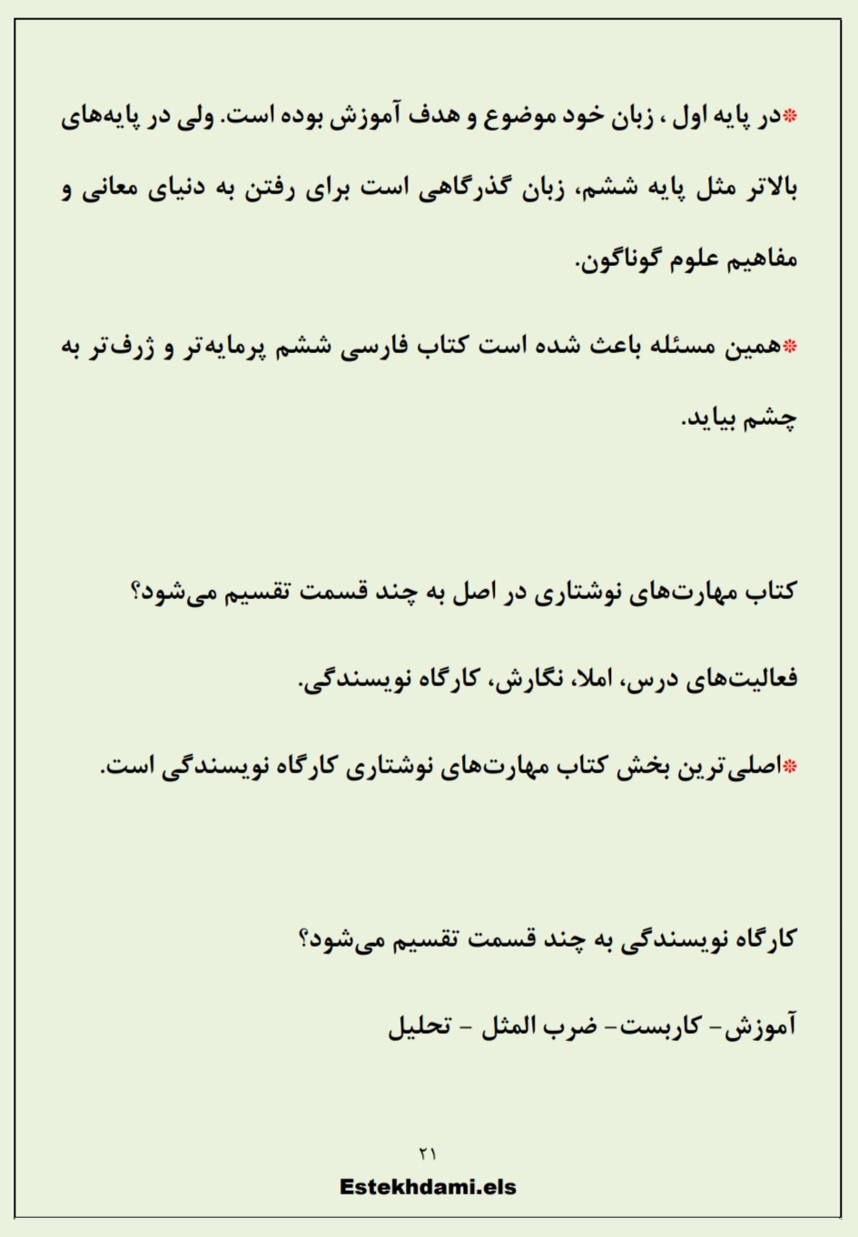 جزوه راهنمای معلم فارسی که هم اکنون در اختیار شما قرار داده خواهد شد، با بیشترین دقت ممکن از منبع اصلی استخراج شده است، به صورتی که پوشش ۱۰۰ درصدی سوالات را در آزمون استخدامی پیش رو داشته باشد.با مطالعه این جزوه در مدت زمان کم باقیمانده میتوانید به آمادگی و تسلط کامل در این درس دست یابید. ✓این منبع در دو نسخه مطالعه با موبایل و نسخه پرینت در اختیار شما قرار داده خواهد شد