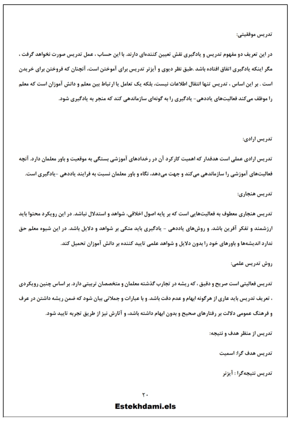 جزوه درس روش ها و فنون تدریس که هم اکنون در اختیار شما قرار داده خواهد شد، با بیشترین دقت ممکن از منبع اصلی استخراج شده است، به صورتی که پوشش ۱۰۰ درصدی سوالات را در آزمون استخدامی پیش رو داشته باشد.با مطالعه این جزوه در مدت زمان کم باقیمانده میتوانید به آمادگی و تسلط کامل در این درس دست یابید. ✓این منبع در دو نسخه مطالعه با موبایل و نسخه پرینت در اختیار شما قرار داده خواهد شد